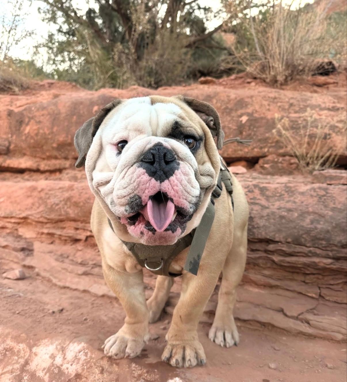 Introducing Brooklyn Payne, our English Bulldog distinguished by her iconic grin and striking icy blue eye. Brimming with a vibrant and distinctive personality, she injects each moment with a delightful touch of eccentricity. Brooklyn is an effervescent spirit, perpetually prepared for a spirited game of fetch or to engage in playful antics with her furry companions. While her unique appearance unquestionably captures attention, it is her exuberant and larger-than-life character that truly distinguishes her. Prepare to be captivated by the infectious energy and undeniable charm of Brooklyn, the Bulldog poised to leave an indelible mark on all those fortunate enough to cross her path.